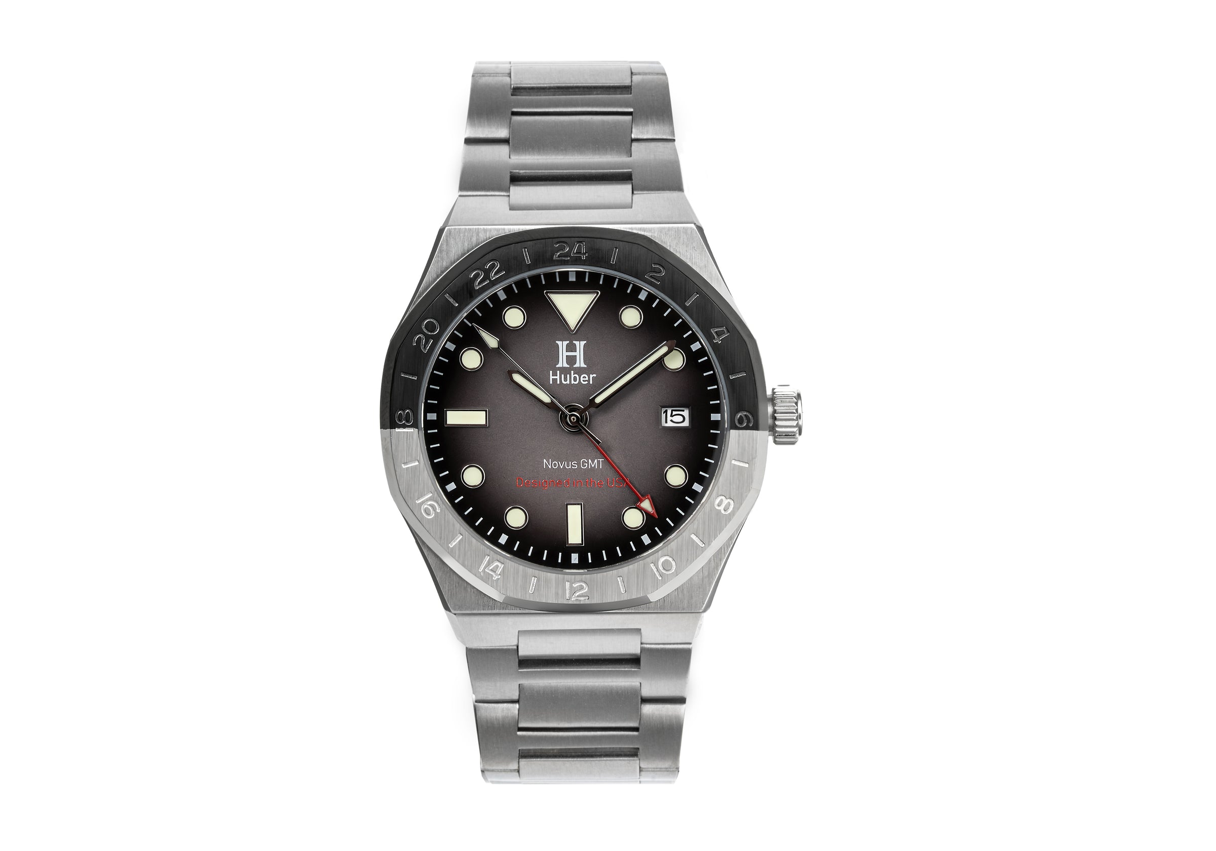 Novus GMT is a bold automatic with Swiss Super-LumiNova, a domed sapphire crystal, a dual color GMT bezel, and a two tone dial. Designed for everyday wear and assembled in Las Vegas.