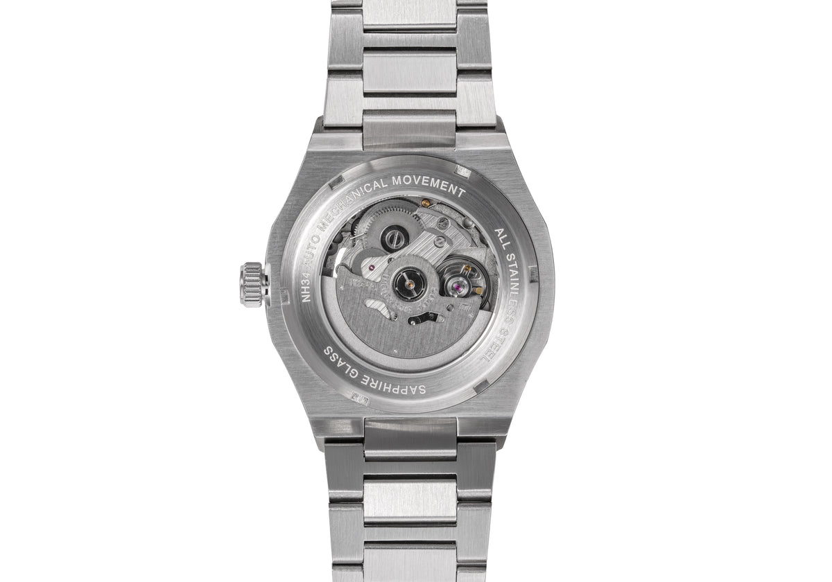 Novus GMT is powered by the Japanese Seiko NH34 automatic mechanical movement, selected for its reliability and GMT functionality for tracking a second time zone.